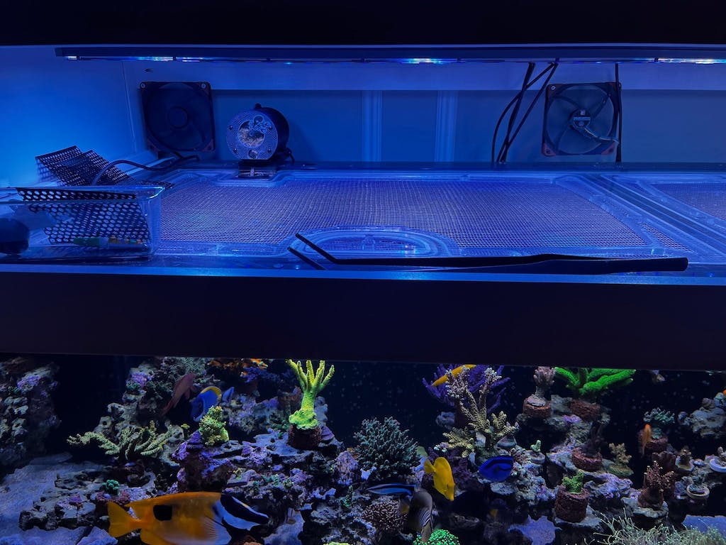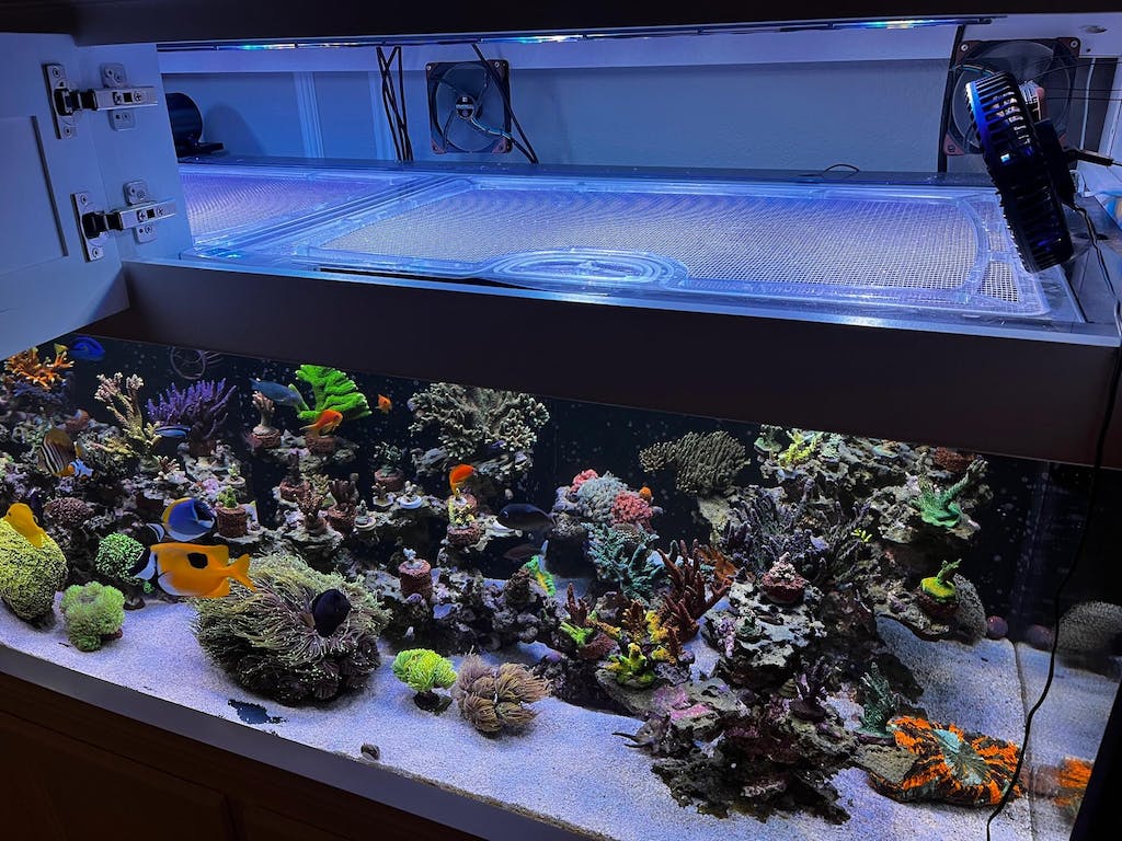 Our lid frames are made from polycarbonate, thick enough to thoroughly support the lid, but slim enough to keep away excessive condensation and salt creep. Our screens are individually made for us, with thin screen fibers that let through more PAR than other screens, and openings small enough (slightly larger than 1/8") for even the smallest fish or eels to not wiggle through. These materials are water-resistant, easy to clean, and provide long-lasting multi-year protection for your aquarium.