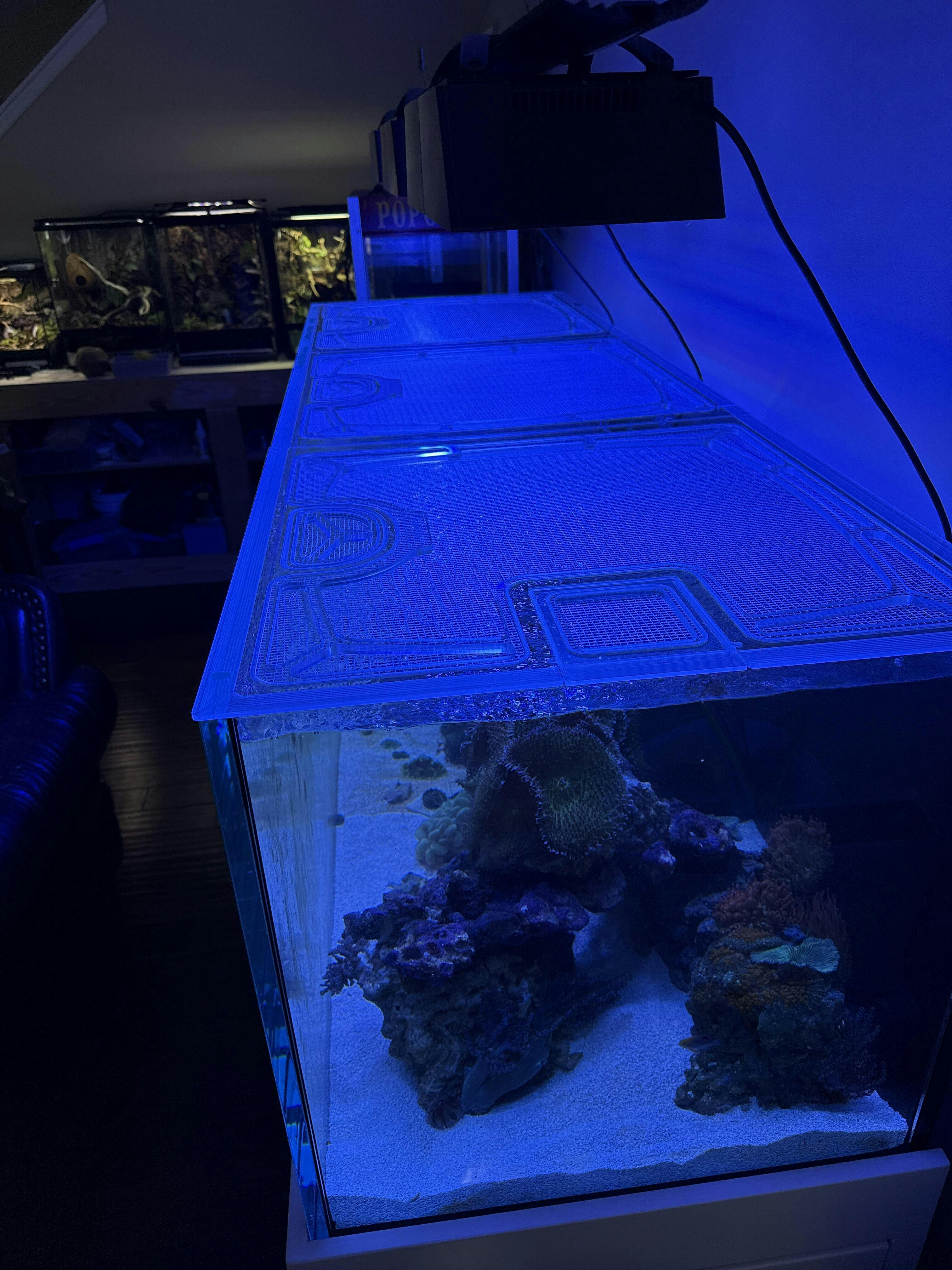 Our lid frames are made from polycarbonate, thick enough to thoroughly support the lid, but slim enough to keep away excessive condensation and salt creep. Our screens are individually made for us, with thin screen fibers that let through more PAR than other screens, and openings small enough (slightly larger than 1/8") for even the smallest fish or eels to not wiggle through. These materials are water-resistant, easy to clean, and provide long-lasting multi-year protection for your aquarium.