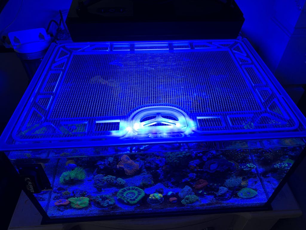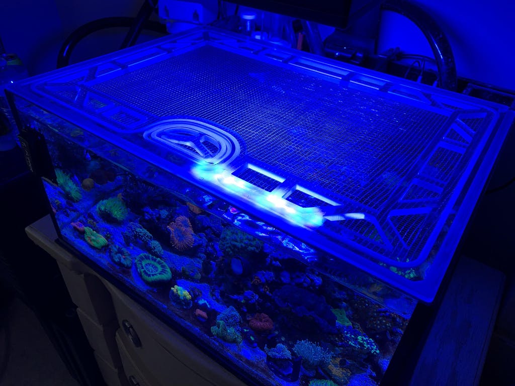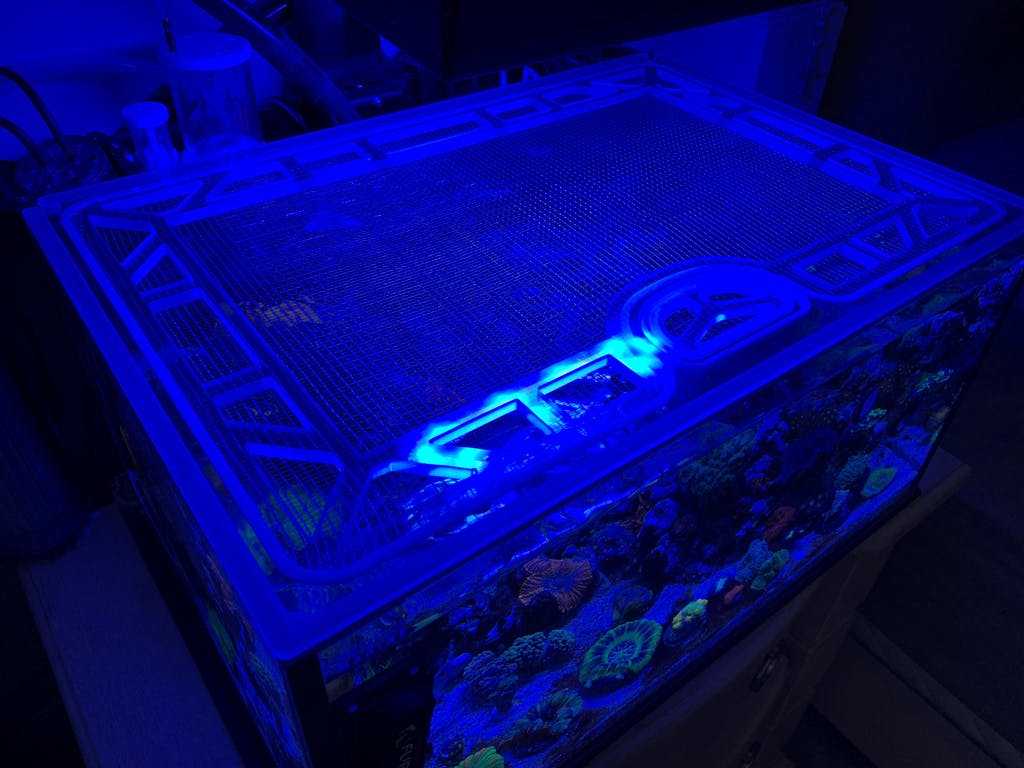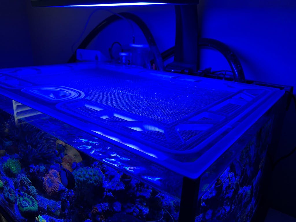 Our lid frames are made from polycarbonate, thick enough to thoroughly support the lid, but slim enough to keep away excessive condensation and salt creep. Our screens are individually made for us, with thin screen fibers that let through more PAR than other screens, and openings small enough (slightly larger than 1/8") for even the smallest fish or eels to not wiggle through. These materials are water-resistant, easy to clean, and provide long-lasting multi-year protection for your aquarium.