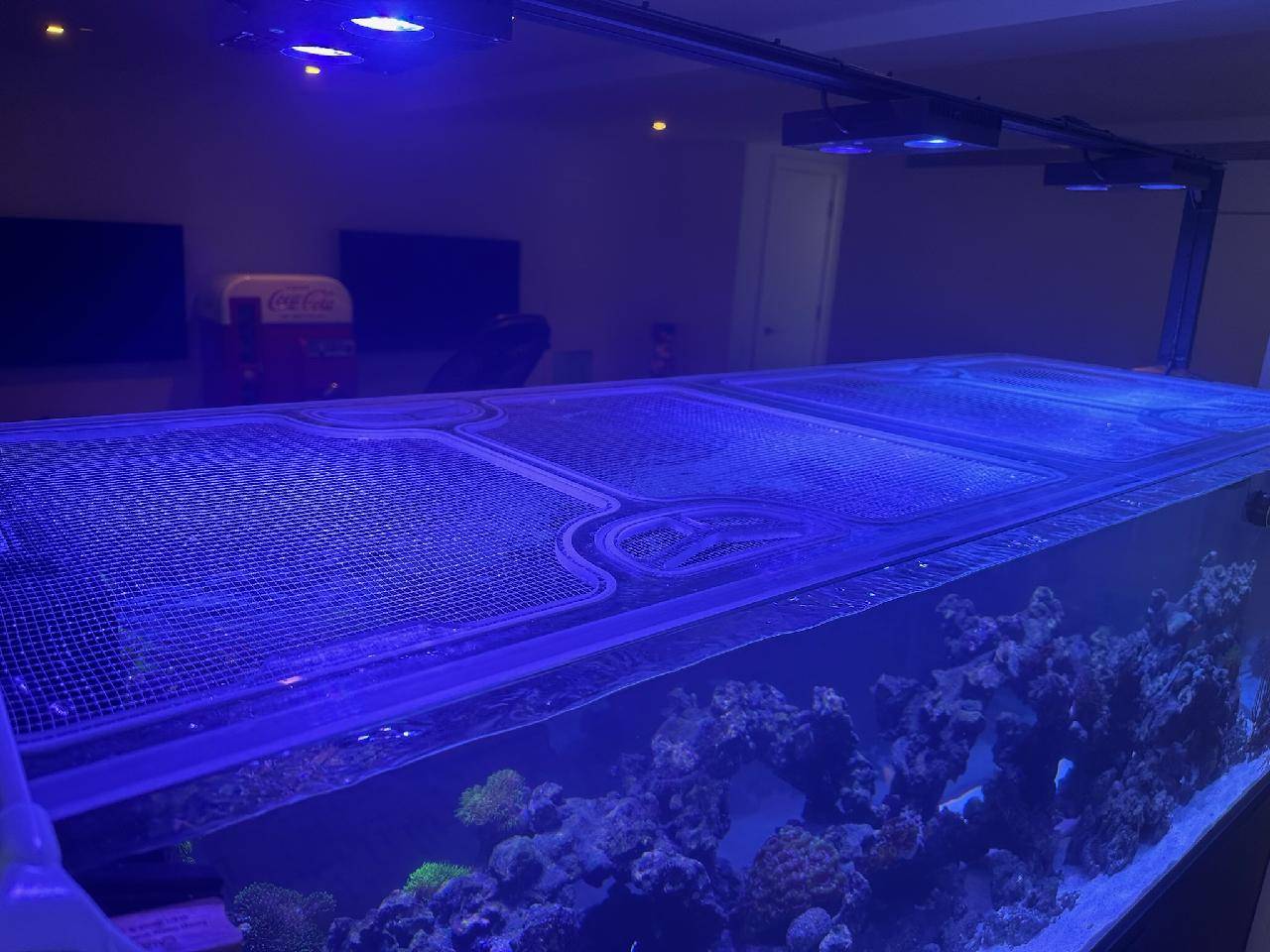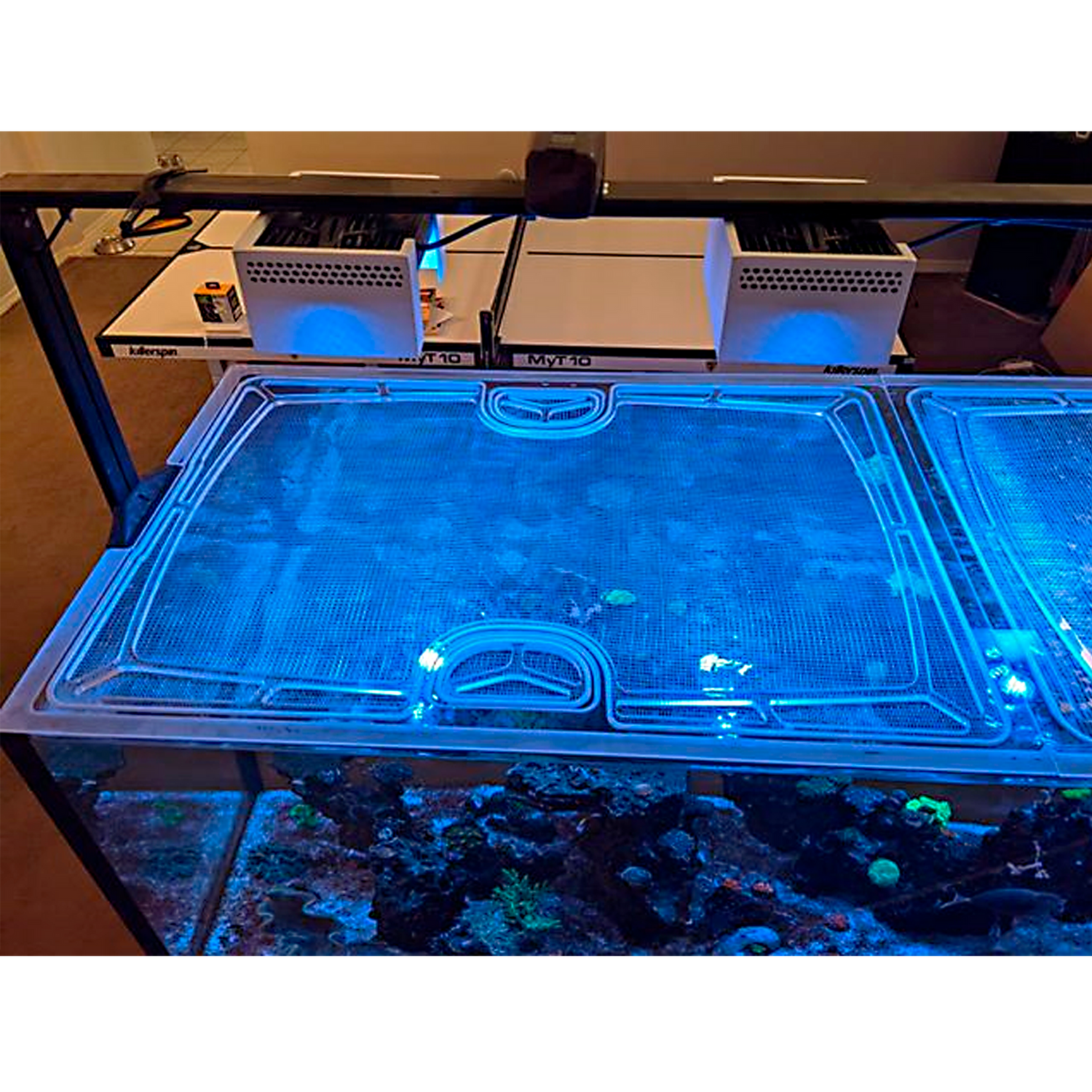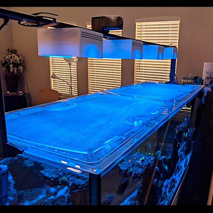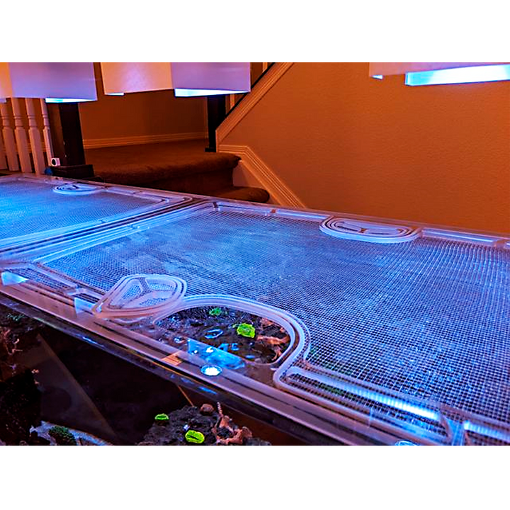 Our lid frames are made from polycarbonate, thick enough to thoroughly support the lid, but slim enough to keep away excessive condensation and salt creep. Our screens are individually made for us, with thin screen fibers that let through more PAR than other screens, and openings small enough (slightly larger than 1/8") for even the smallest fish or eels to not wiggle through. These materials are water-resistant, easy to clean, and provide long-lasting multi-year protection for your aquarium.